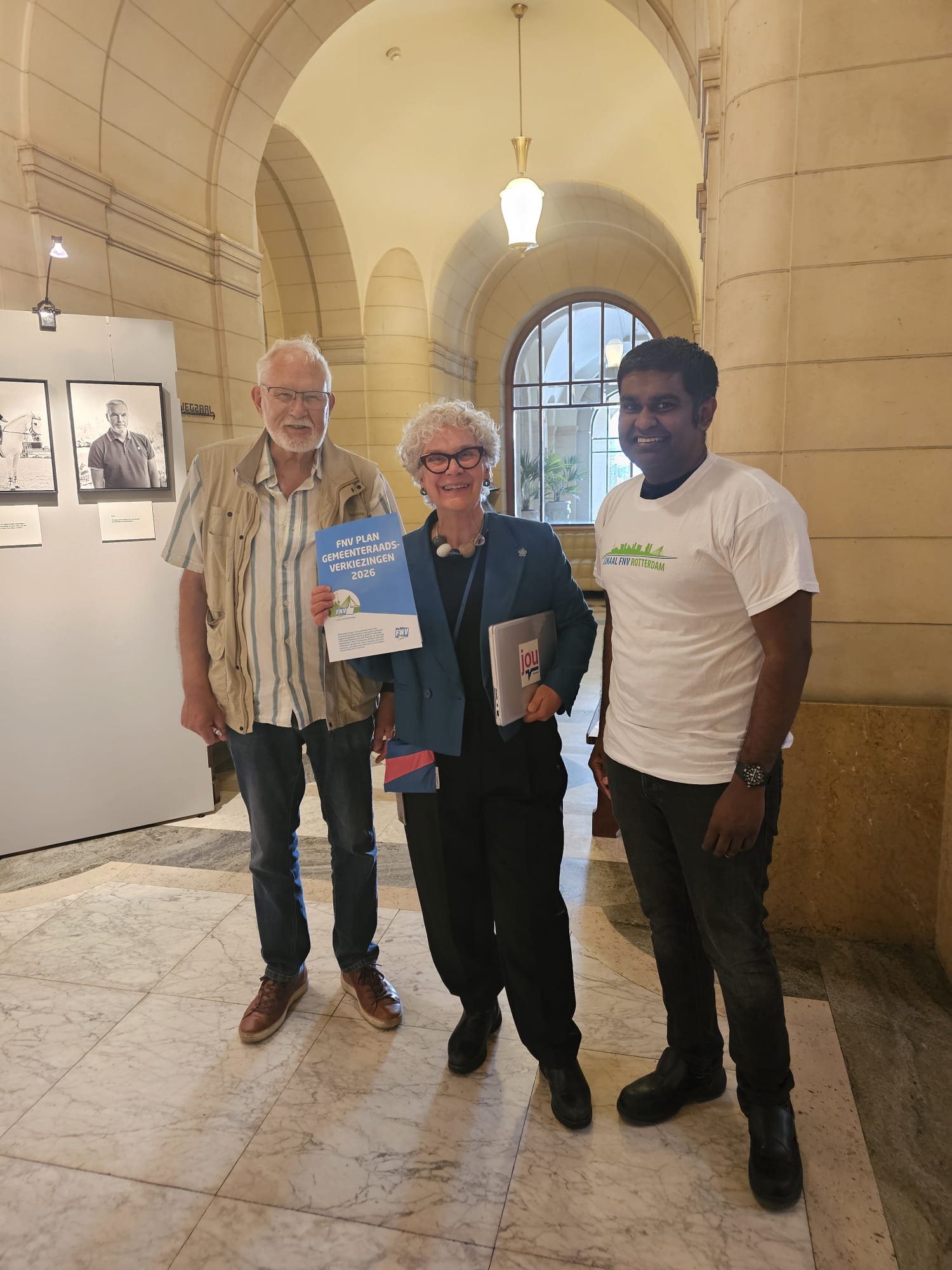 Op donderdag 19 juni hebben wij namens lokaal FNV Rotterdam het FNV-plan voor de gemeenteraadsverkiezingen 2026 aangeboden aan de politieke partijen binnen de gemeenteraad van Rotterdam. De overhandiging vond plaats in het Stadhuis, op een moment dat het onderwerp armoede op de raadsagenda stond – een onderwerp dat naadloos aansluit bij de kern van ons plan. We gingen in gesprek met vertegenwoordigers van onder andere VVD, VOLT, CDA, CU, Partij voor de Dieren, PvdA, GroenLinks, Leefbaar Rotterdam, DENK en Ellen Verkoelen. De partijen SP, D66 en ChristenUnie waren helaas hierbij niet aanwezig, maar hun collega’s nemen het plan voor hen mee.